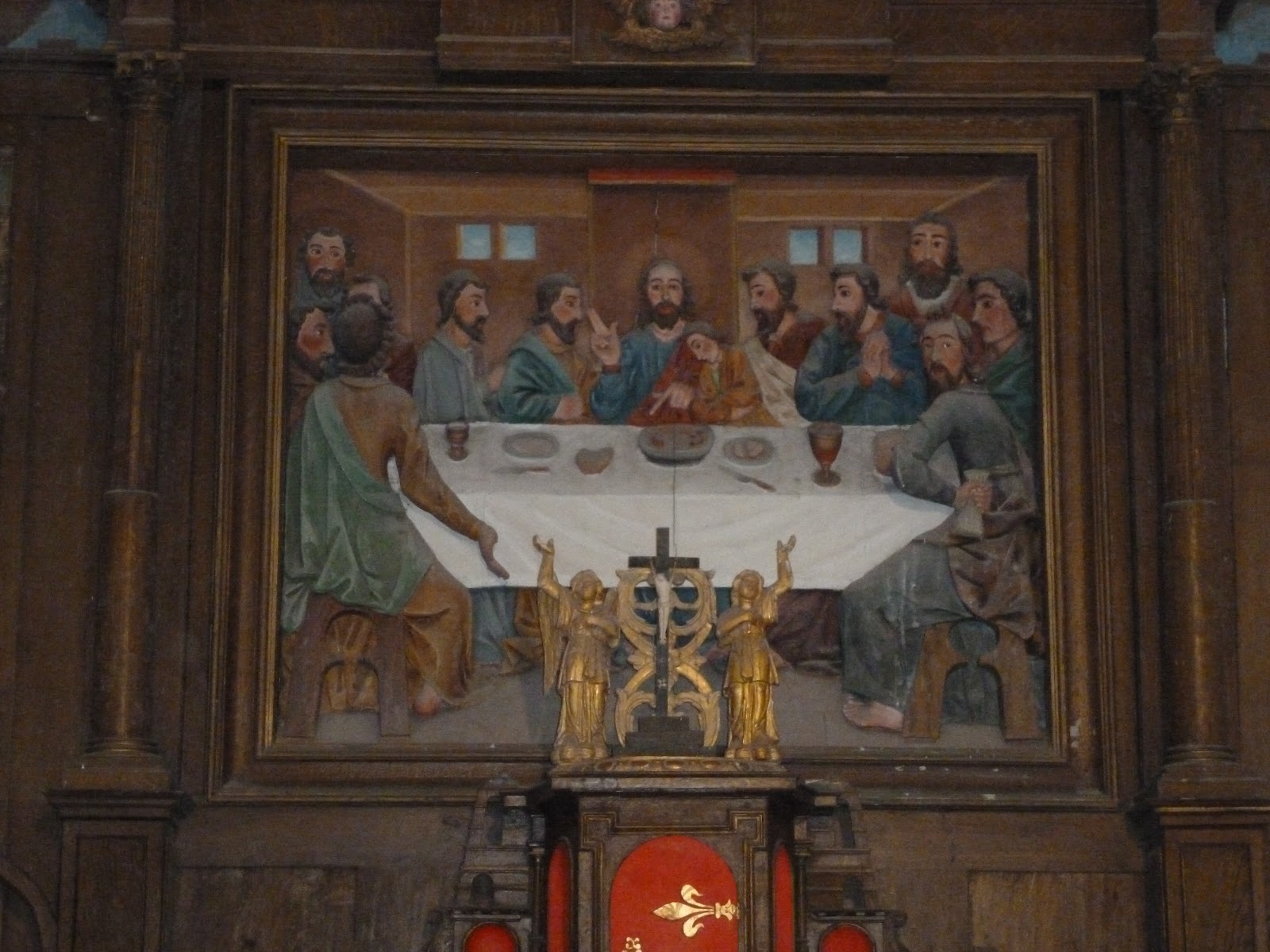 Bas relief polychrome représentant la Cène, le dernier repas du Christ avec ses apôtres.