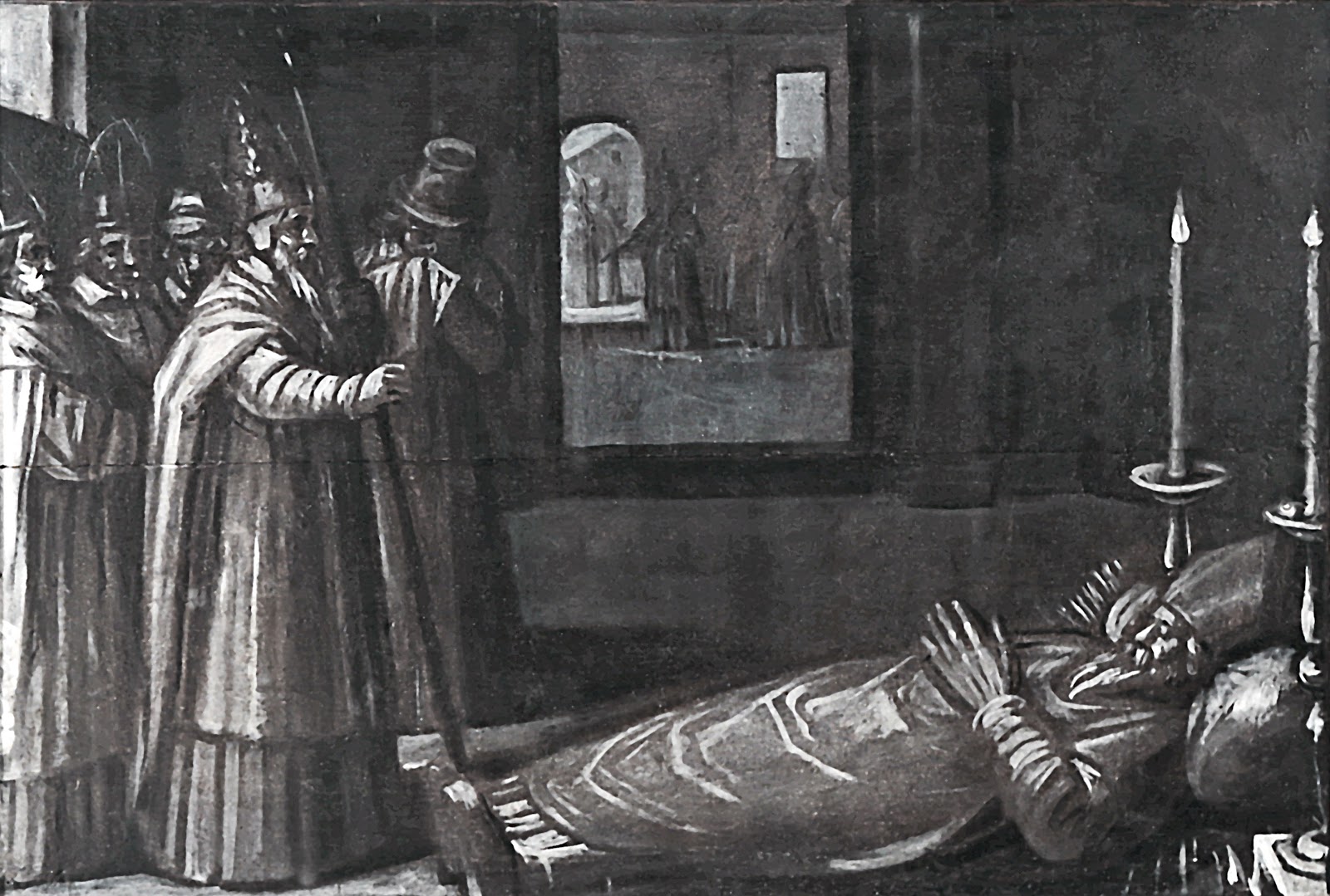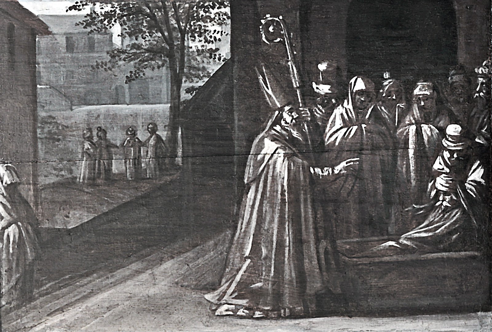 L’évêque qui le bénit est sans doute de saint Ambroise de Milan qui, selon une légende rapportée par Grégoire de Tours, avait assisté à la mort de Martin.