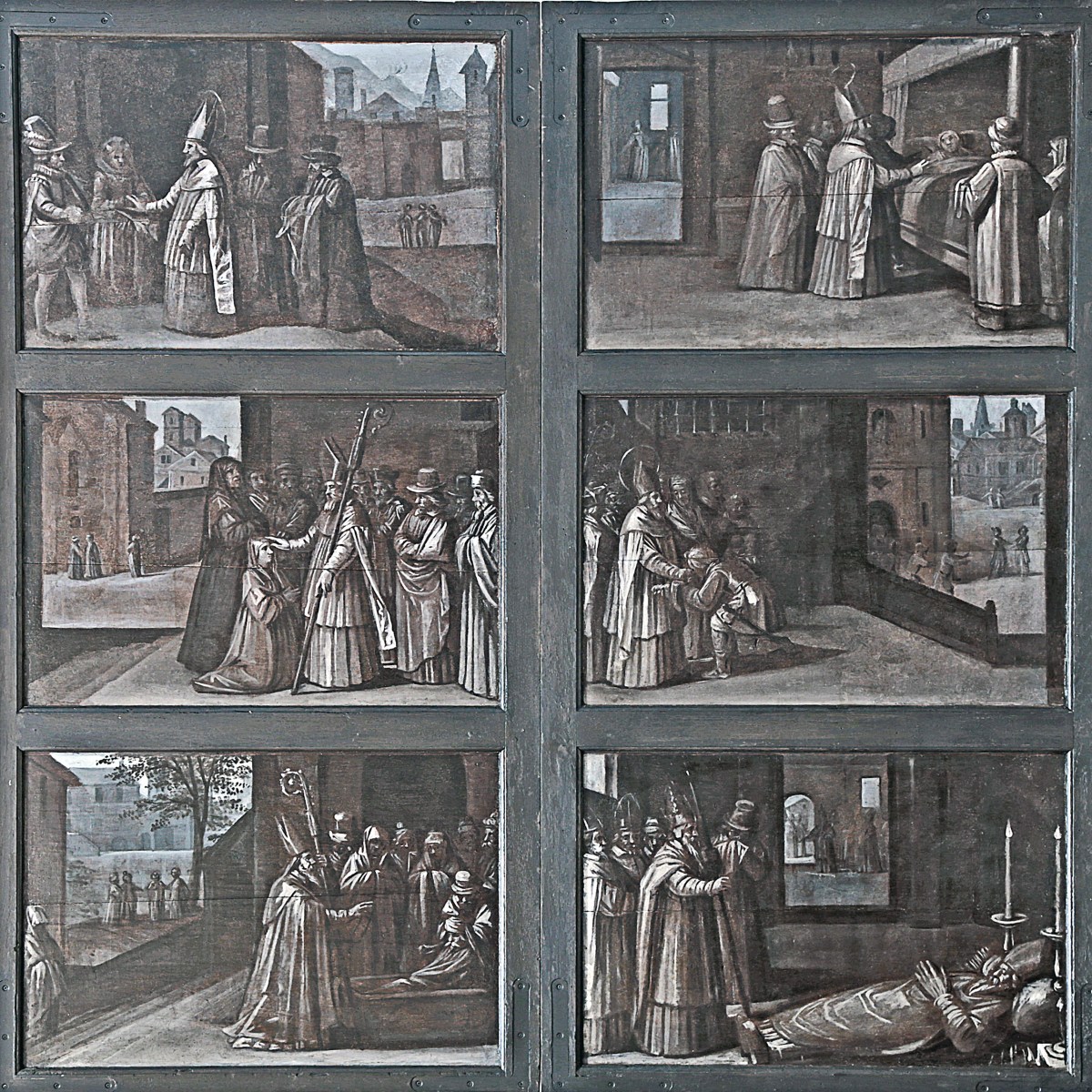 Sur le premier tableau, en haut à gauche, notre saint évêque rencontre ce qui semble être des personnages importants reconnaissables à leurs riches vêtements.