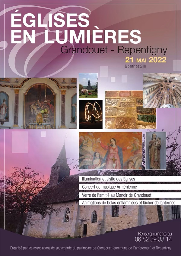 Ce 21 mai 2022, à 21h, le premier rendez-vous vous est proposé à l’église St Martin de Repentigny qui sera, pour l’occasion, parée de mille feux. Une conférence vous permettra de mieux connaitre le riche patrimoine qu’elle renferme, et notamment le plus vieux retable du pays d’Auge, dont les origines flamandes vous seront révélées. Quand la nuit sera tombée, nous visiterons le vieux cimetière familial de la famille Thierry – Le Cesne qui n’aura plus de secret pour vous !