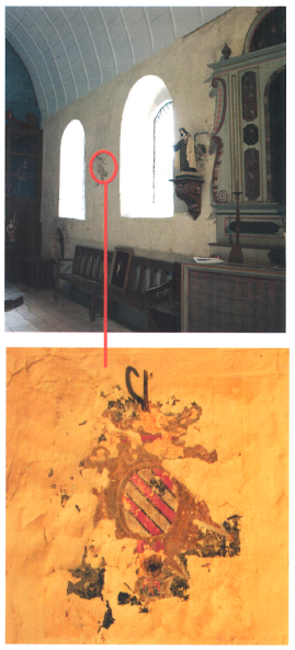 De chaque côté de l’entrée de l’église, deux blasons ont été collés sur un enduit à base d’argile.