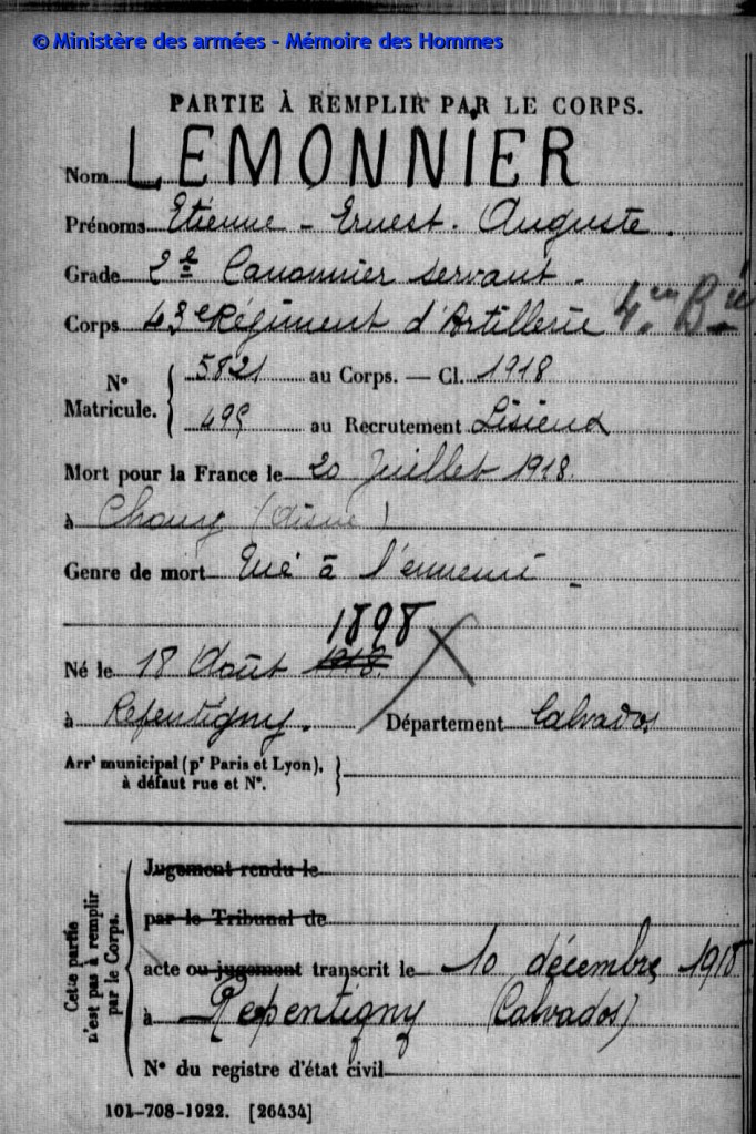 Né à Repentigny le 18/8/1898, mort pour la France le 20/7/1918 à 19 ans, 11 mois et 2 jours, à Chouy (Aisne) – Servant au 43 ème régiment d’artillerie.